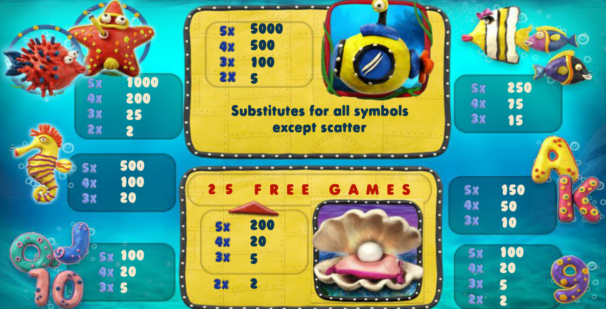 Как и в большинстве игровых автоматов здесь присутствует дикий символ, представлен он в виде Субмарины. Благодаря ему можно значительно проще собирать выигрышные комбинации и соответственно получать деньги. Также есть и Жемчужина, которая здесь скаттер. Собираете всего 3 штуки и получаете бесплатные вращения. Это прекрасный вариант для быстрого заработка. Символы океанических жителей обладают достаточно приемлемы для игроков коэффициентами, а вот карточные скорей рядовые и самые дешевые.